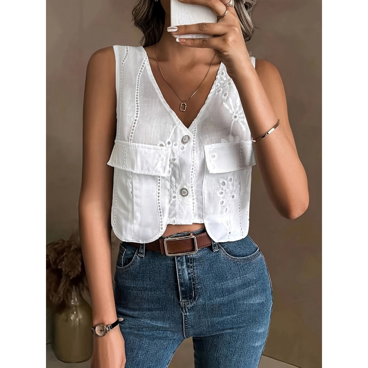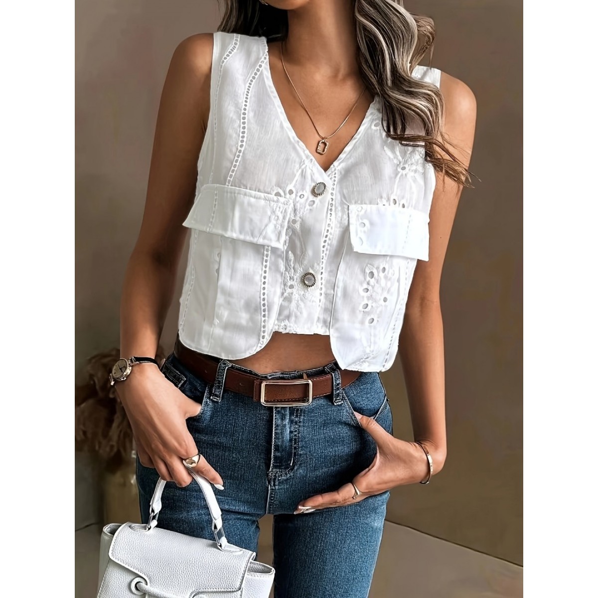 Artangle Eyelet Vests Embroidery Button Front Vest, Casual Sleeveless Flap Pockets Tank Top For Spring & Summer, Women's Clothing M