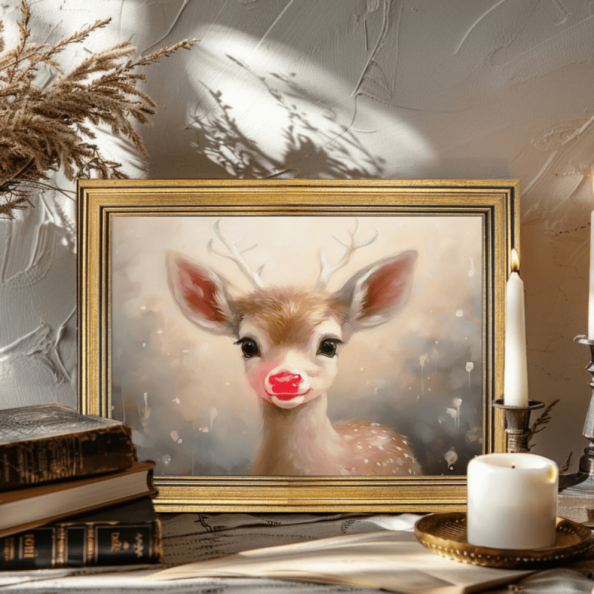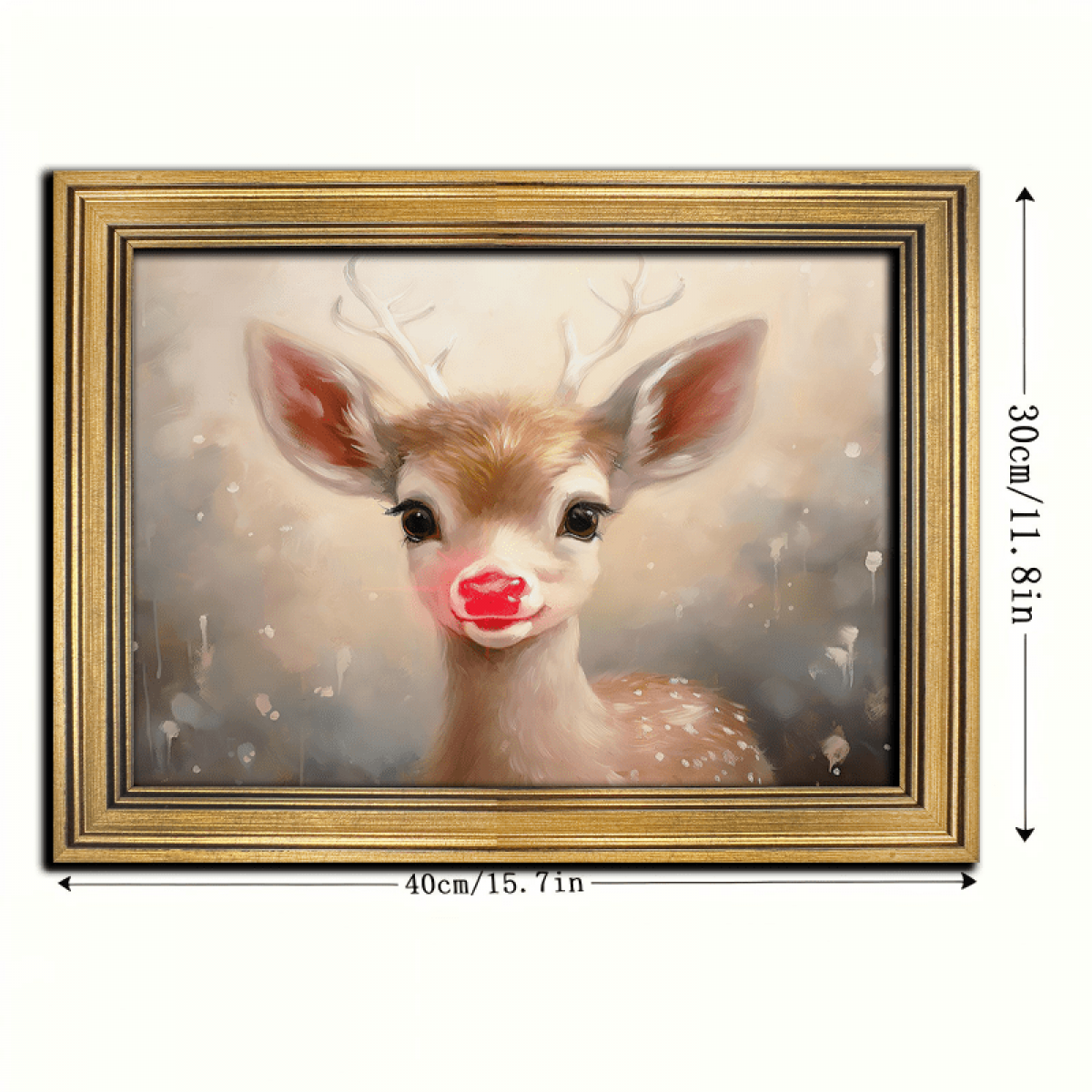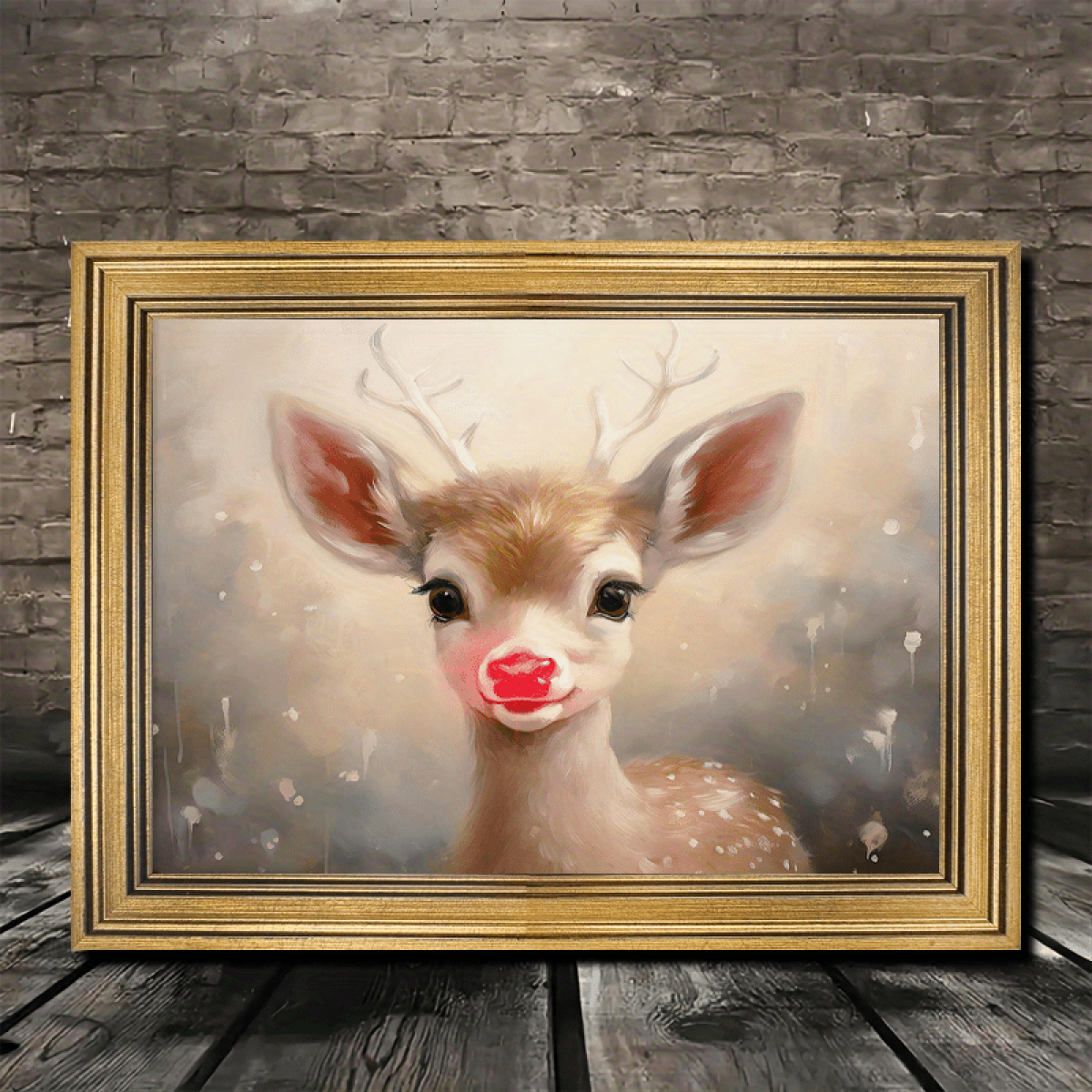 - The Vintage Adorable Reindeer with Red Nose frame adds a dose of holiday cheer to any room. Its charming illustration and vintage style evoke the warmth and magic of Christmas, creating a festive and welcoming atmosphere for both family and guests.