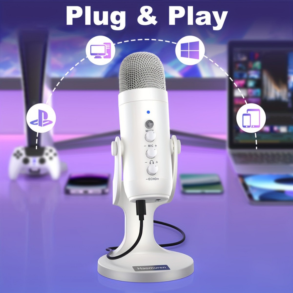 Setup: Simply connect the microphone to your PC or phone using the provided USB Type-C cable. Ensure that any necessary permissions are granted by your device to access the microphone.